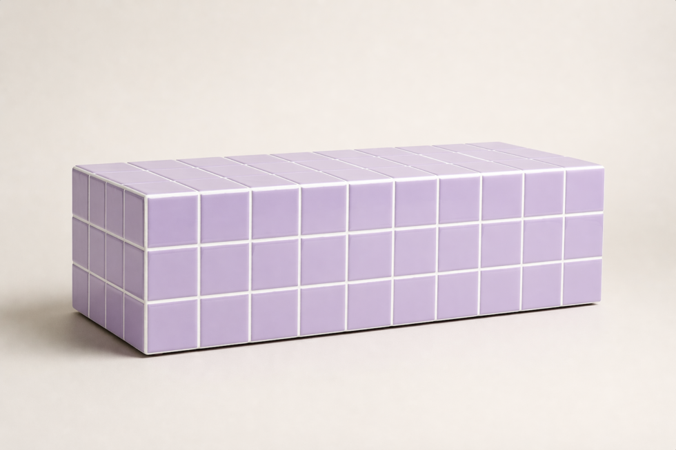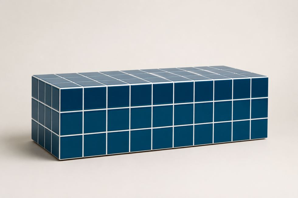 Seu desenho simples valoriza a materialidade da cerâmica, o grid dos módulos e a relação entre cor do azulejo e rejunte. Dependendo da configuração, pode atuar como banco, apoio central ou elemento de destaque no ambiente.