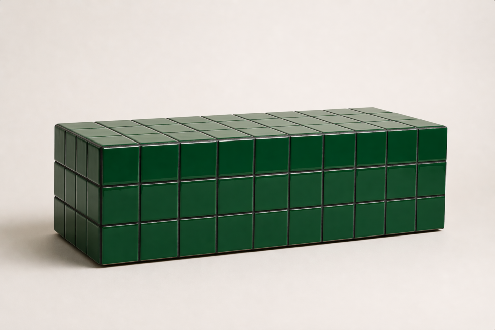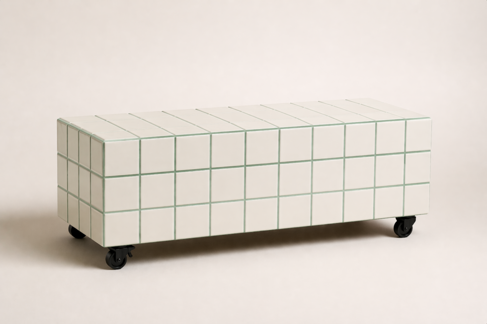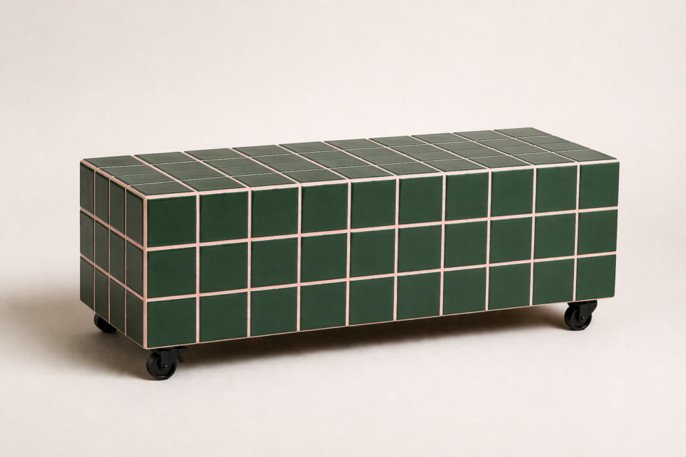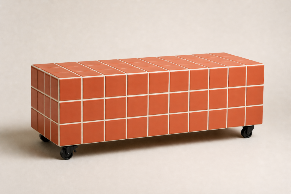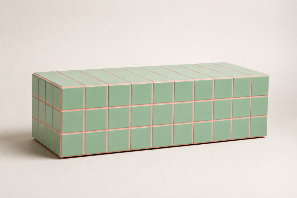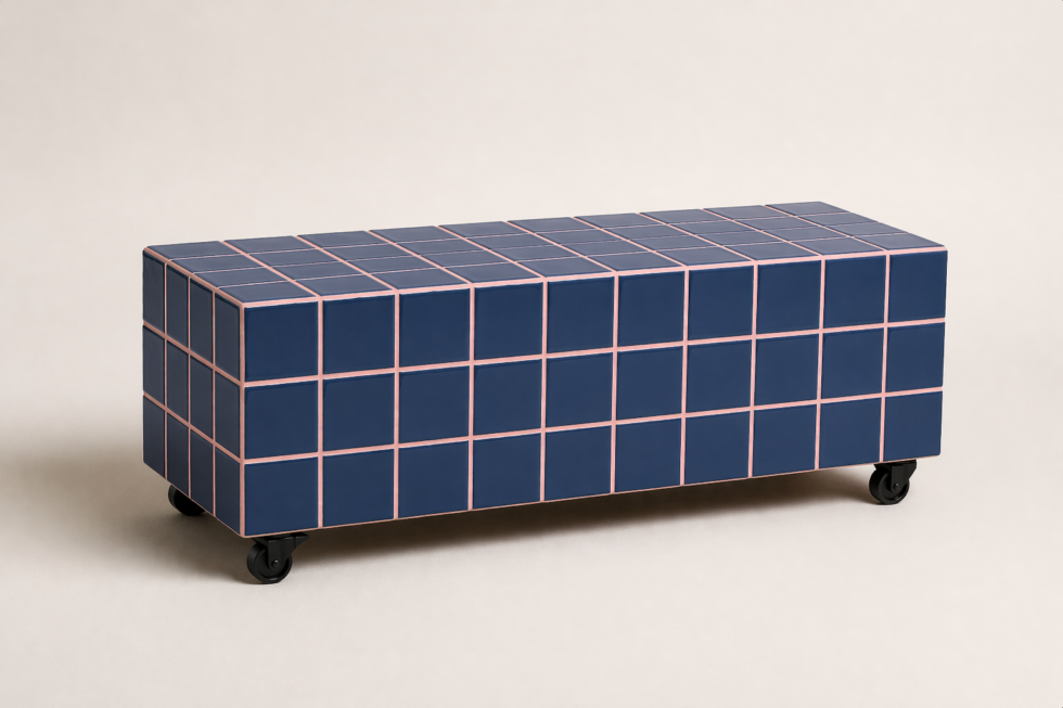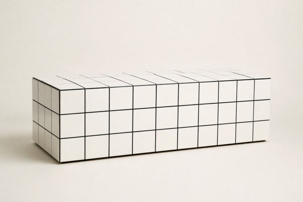 Bloco 100 nasce da lógica modular do azulejo aplicada ao mobiliário. A peça explora repetição, ritmo e contraste cromático em um volume de leitura arquitetônica.