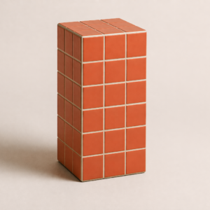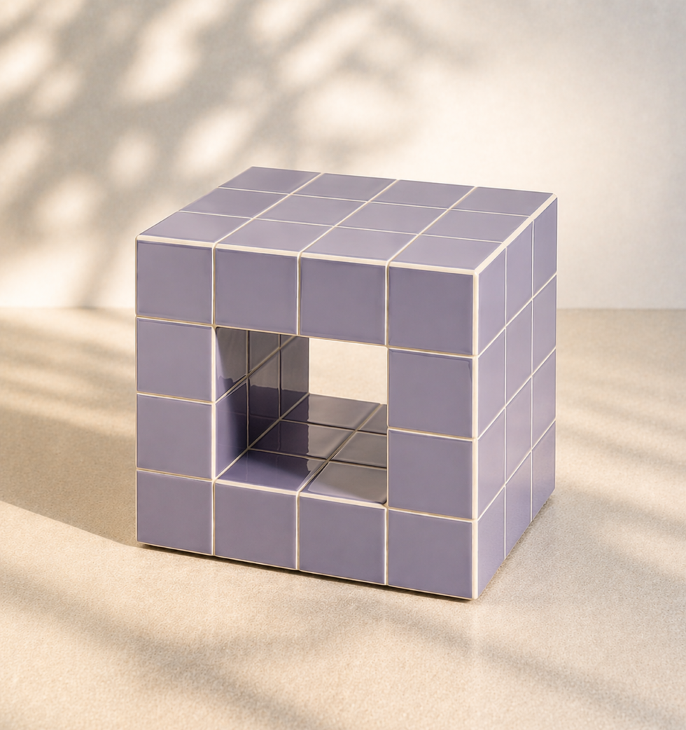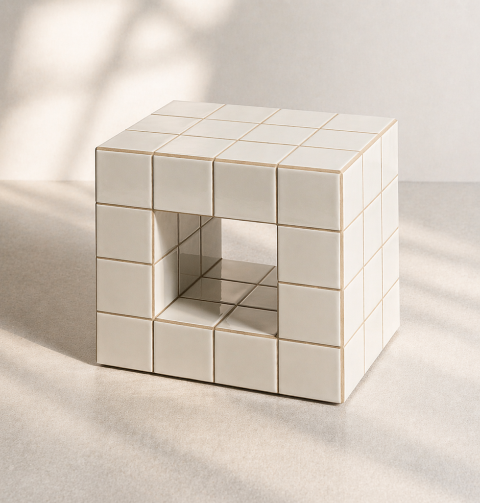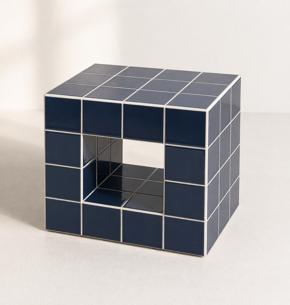 Peça compacta em azulejo modular, pensada para funcionar como nicho, apoio lateral ou pequeno volume escultórico.