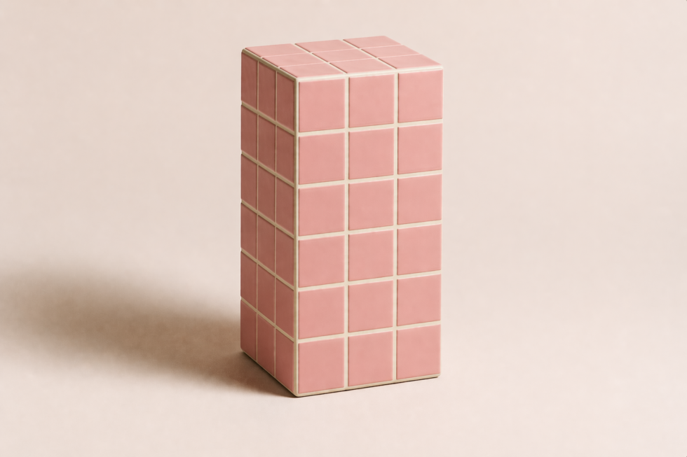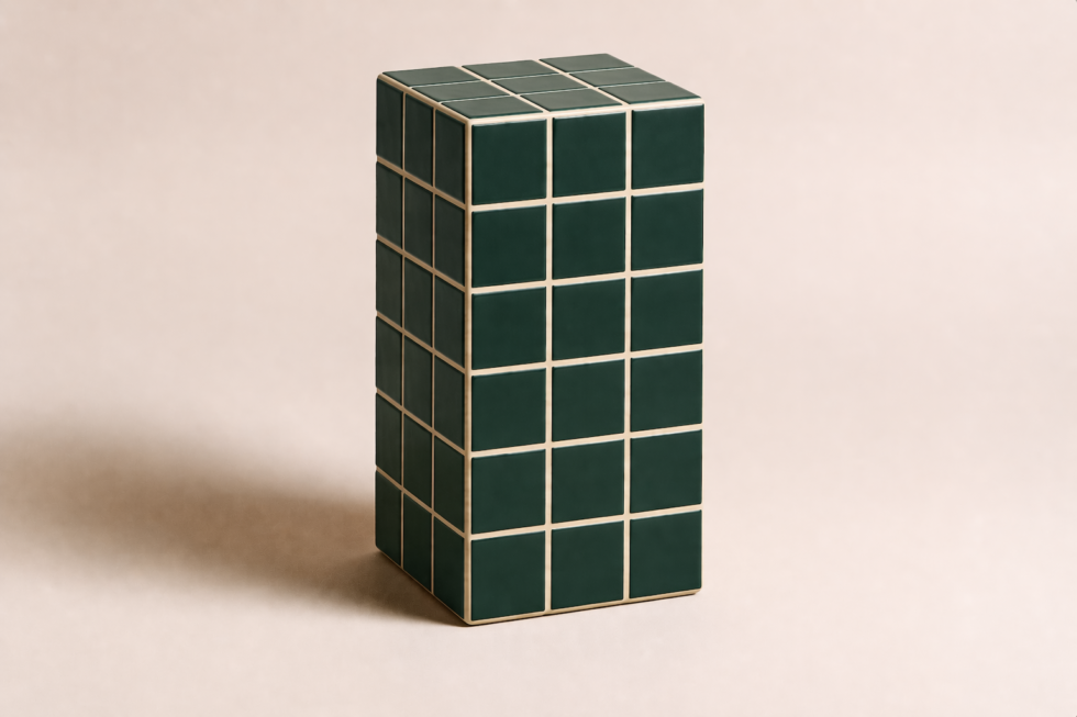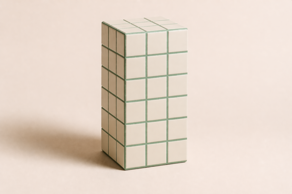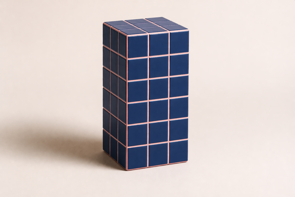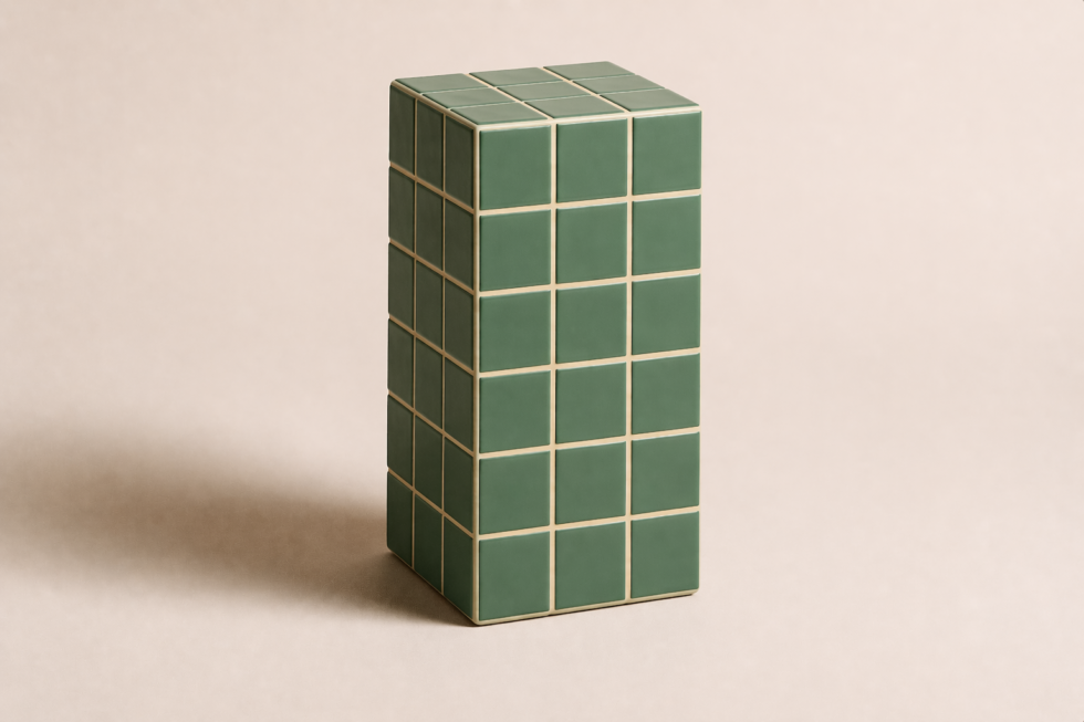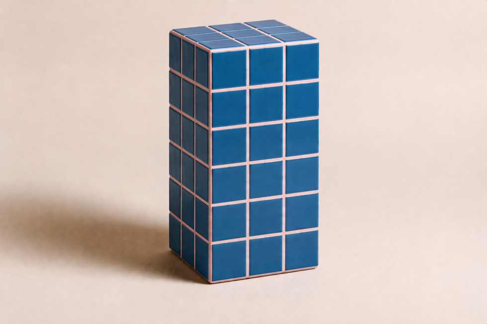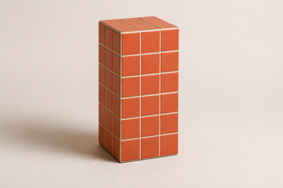 Volume vertical em azulejo modular com forte leitura gráfica, ideal como apoio, banco ou peça de composição.