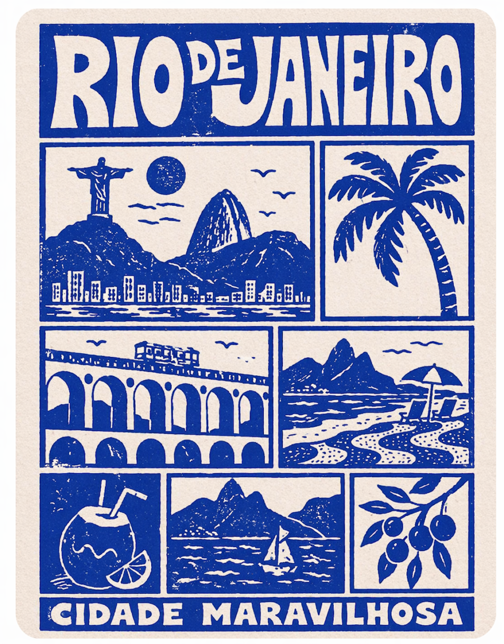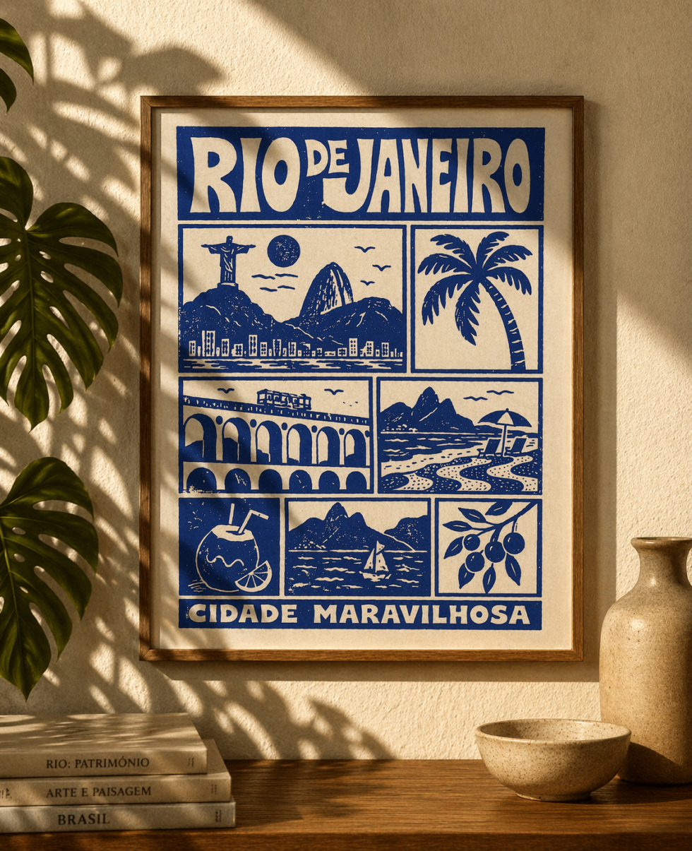 Cidade Maravilhosa organiza cenas, símbolos e ritmos visuais do Rio em uma composição em blocos, com linguagem gráfica intensa e contemporânea.